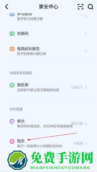3、点击后返回家长中心,再次在时长管理下,点击每天的按钮。