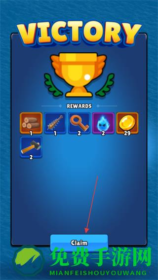 4、通关后点击Claim领取奖励,获取木材、金币等资源,继续岛屿探索。