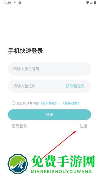 1、打开麻麻康APP,在手机快速登录页面点击注册。