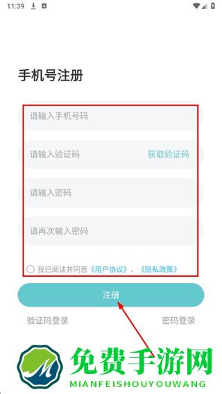 2、输入手机号码,点击获取验证码并填入,设置密码并再次输入确认,勾选用户协议后,点击注册。