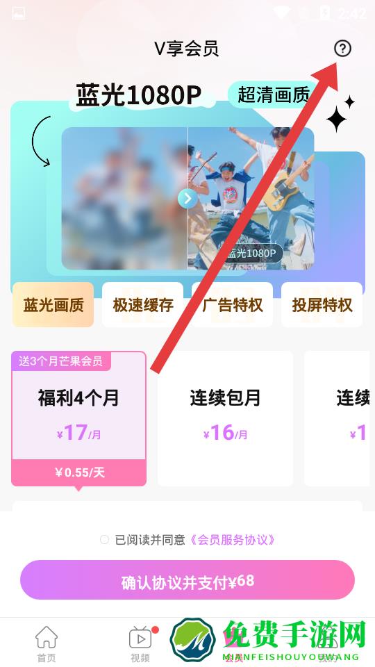 1、打开韩剧TV,点击底部会员进入V享会员页面,再点击右上角圆形问号图标。