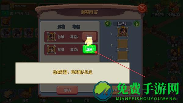 4、在调整阵容界面选择武将如程普,将其编入队伍,优化战斗阵容,为攻城等战斗做好准备。