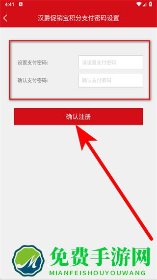 4、进入支付密码设置页面,设置并确认支付密码,点击确认注册按钮,完成账号注册流程。
