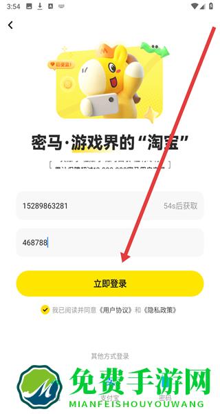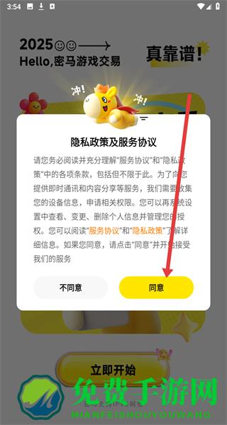 1、在密马游戏交易APP的“隐私政策及服务协议”弹窗点击“同意”,进入主界面。