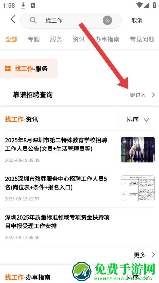 2、或者在页面搜索框输入找工作,选择靠谱招聘查询服务项,点击一键进入,系统将优先展示官方认证、信息透明的招聘资源。