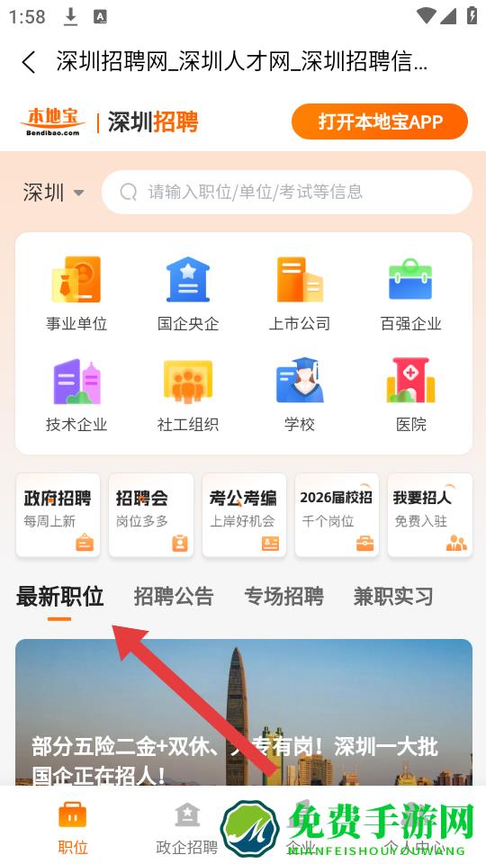 1、打开本地宝APP,在首页导航栏找到招聘板块并点击,进入招聘专属页面,该板块聚合各类就业信息,涵盖国企、事业单位等多类招聘渠道。