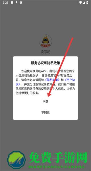 1、在换号吧APP的“服务协议和隐私政策”弹窗点击“同意”,进入主界面。