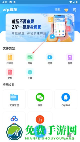 1、打开zip解压应用,点击图片选项,进入选图页。