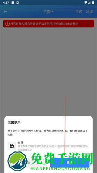 2、在弹出的存储权限温馨提示框中,点击确定。