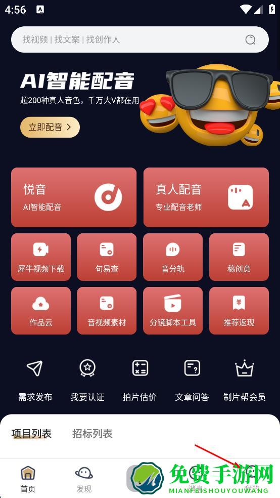 1、打开制片帮APP首页,点击右下角我的按钮。