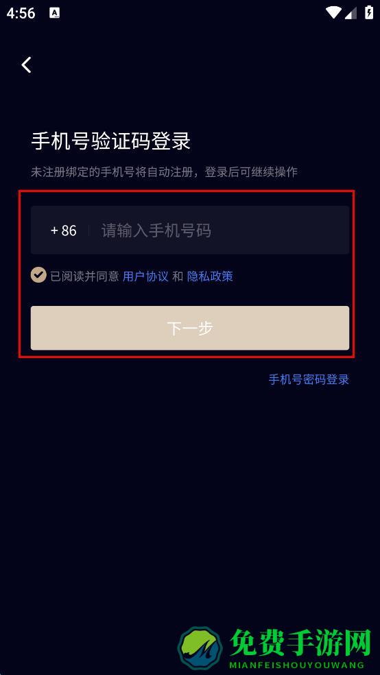 3、在手机号验证码登录页面,输入手机号码,点击下一步按钮。