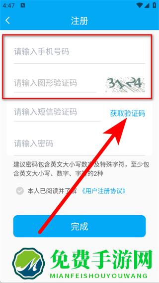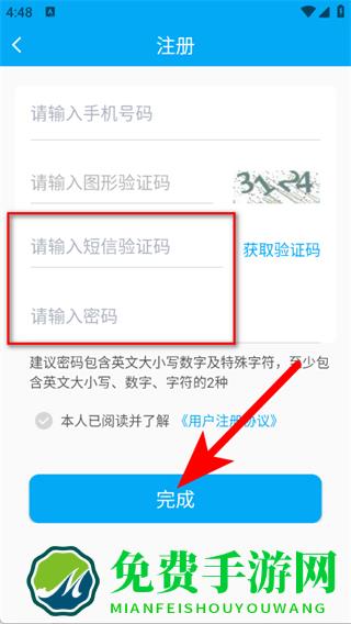 4、输入短信验证码和密码,点击完成,完成账号注册。