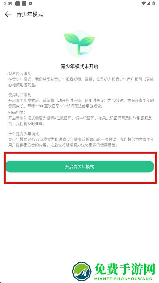 3、在青少年模式页面点击开启青少年模式按钮,按提示设置4位数密码即可开启。
