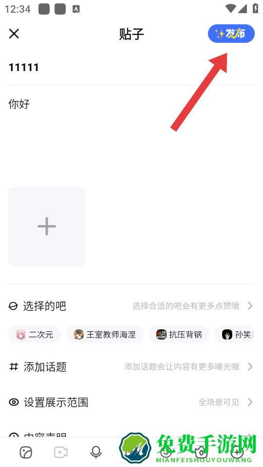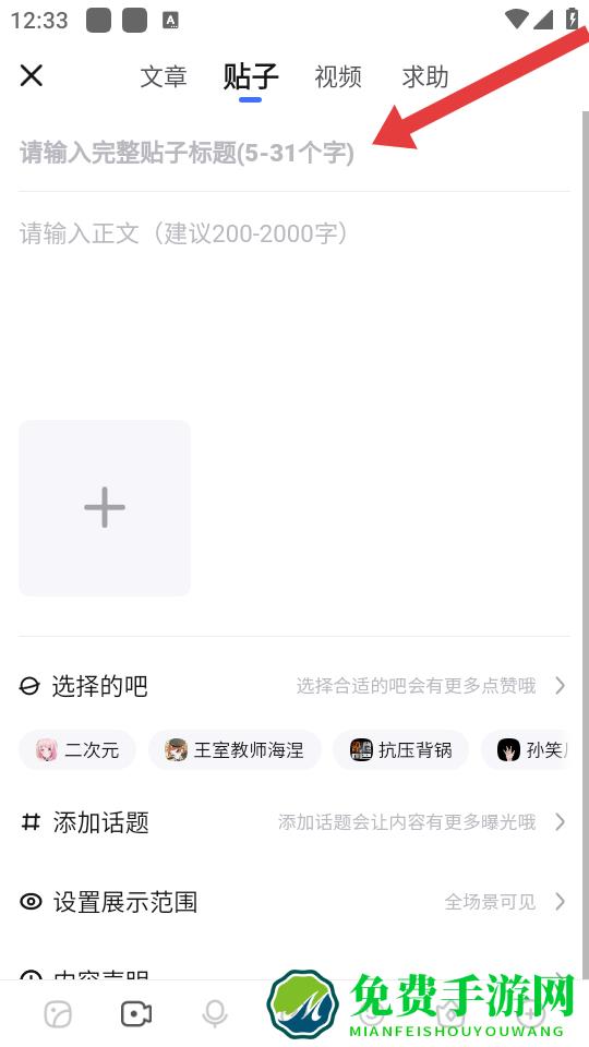 2、在发布菜单中切换到帖子标签,进入编辑页面,填写帖子标题,输入正文还可添加图片、选择发布的吧、设置话题与展示范围等。