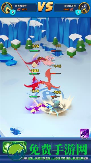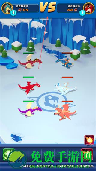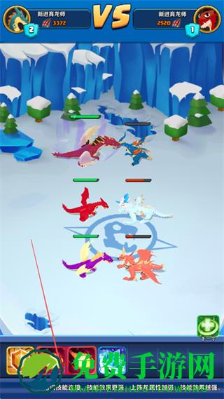 2、点击下方技能按钮,相同技能连接使用效果更强,上方龙属性越强,技能效果越显著,以此对敌方龙造成伤害或为己方龙提供增益。