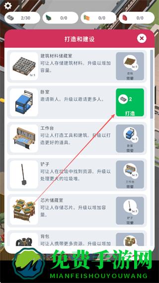 3、根据提示,在打造和建设界面选择建筑如卧室,点击打造按钮消耗资源进行修建。