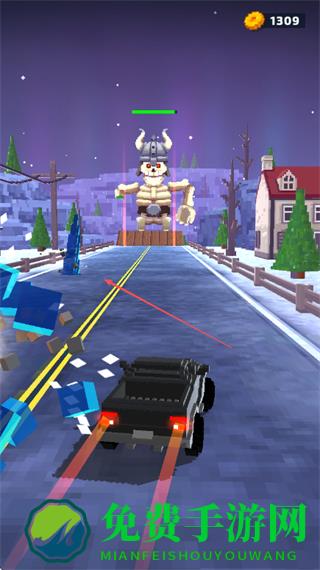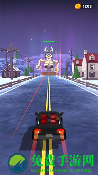 1、驾驶车辆在赛道上行驶,朝着巨型敌人如骷髅巨人前进,发射攻击。