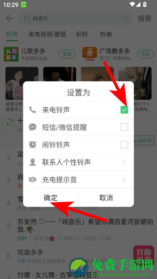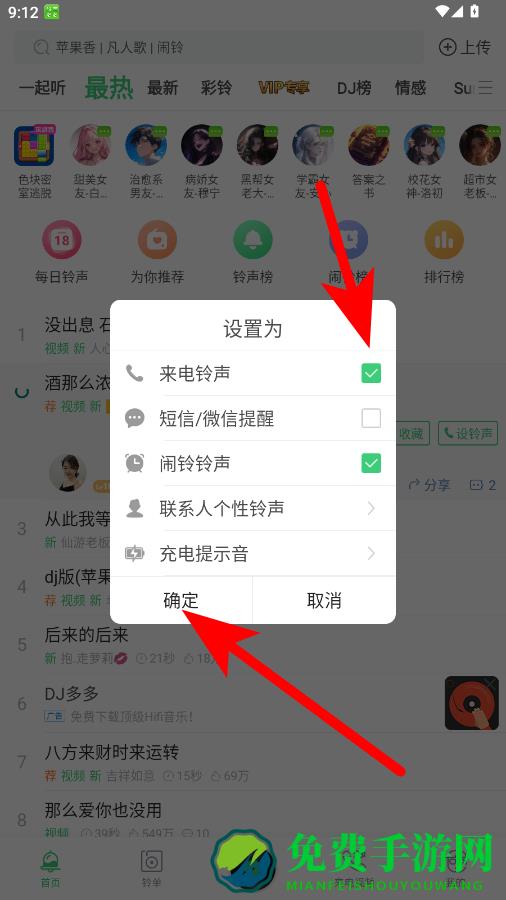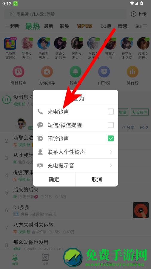 4、在设置选项框中,选择来电铃声并点击确定,即可完成来电铃声设置。