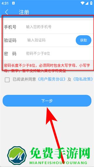 4、输入手机号,点击获取验证码,设置符合要求的密码,勾选后,点击下一步,完成账号注册。
