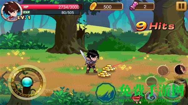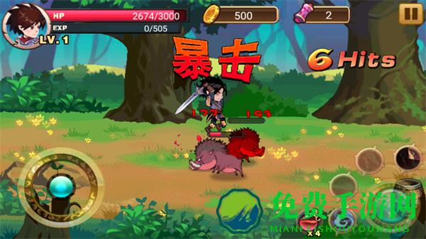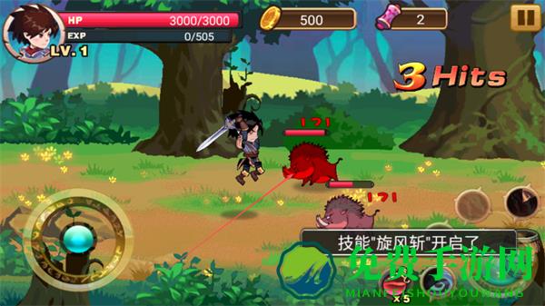 1、操控角色在森林场景中攻击野猪等怪物,技能“旋风斩”可开启,连击敌人积累Hits数。