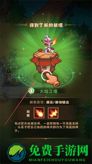 3、解锁新箭塔如火焰之塔,点击塔进行升级,提升群体/群帅输出能力。