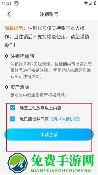 4、在注销账号页面,勾选后点击申请注销,完成注销操作。