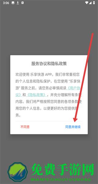 1、在乐享快游APP的“服务协议和隐私政策”弹窗点击“同意并继续”,进入主界面。
