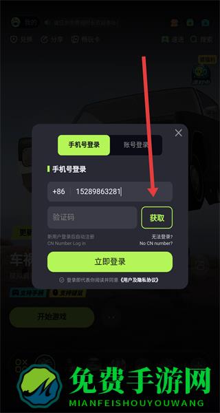 3、在手机号登录界面输入手机号码,点击“获取”验证码。