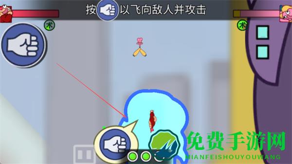 1、点击拳头按钮,操控角色飞向敌人并攻击,在蓝色区域内发起进攻。
