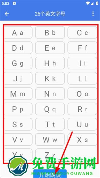 4、在26个英文字母页面,点击开始朗读,开始学习英文字母。