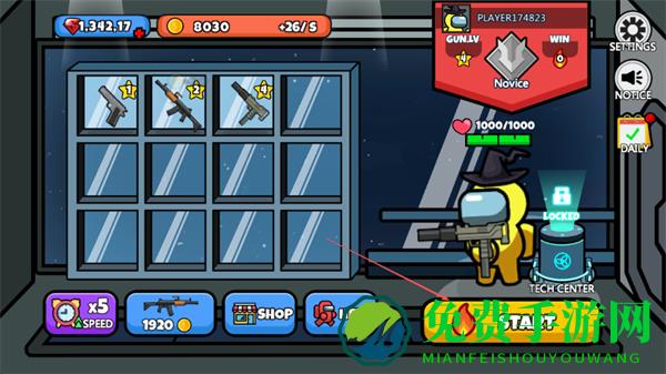 1、在武器界面解锁枪械,装备后点击START进入游戏,准备参与太空大逃杀。