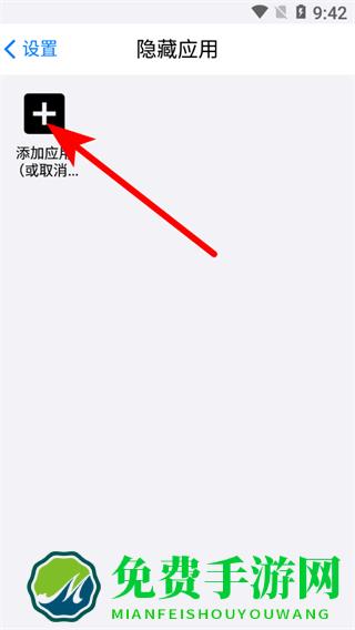 2、在隐藏应用设置页面,点击添加应用图标,进入应用选择页面。