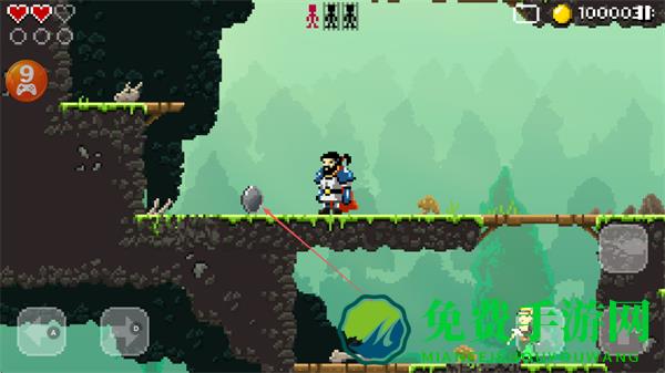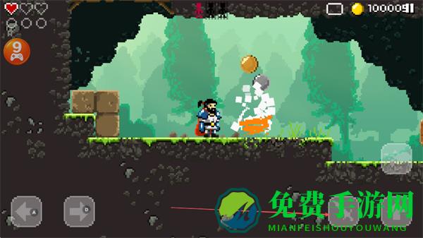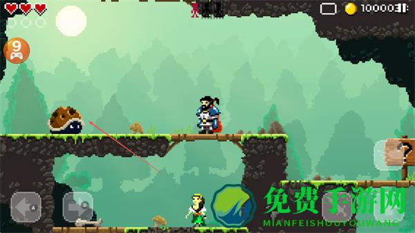 1、操控勇士在像素场景中,利用武器攻击蜗牛等敌人,探索带问号木牌区域,收集金币。