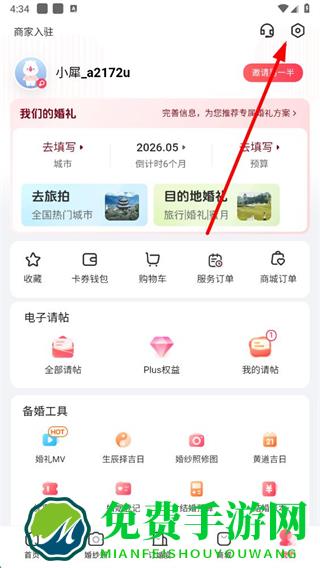 1、打开婚礼纪app,在我们页面点击右上角设置图标。