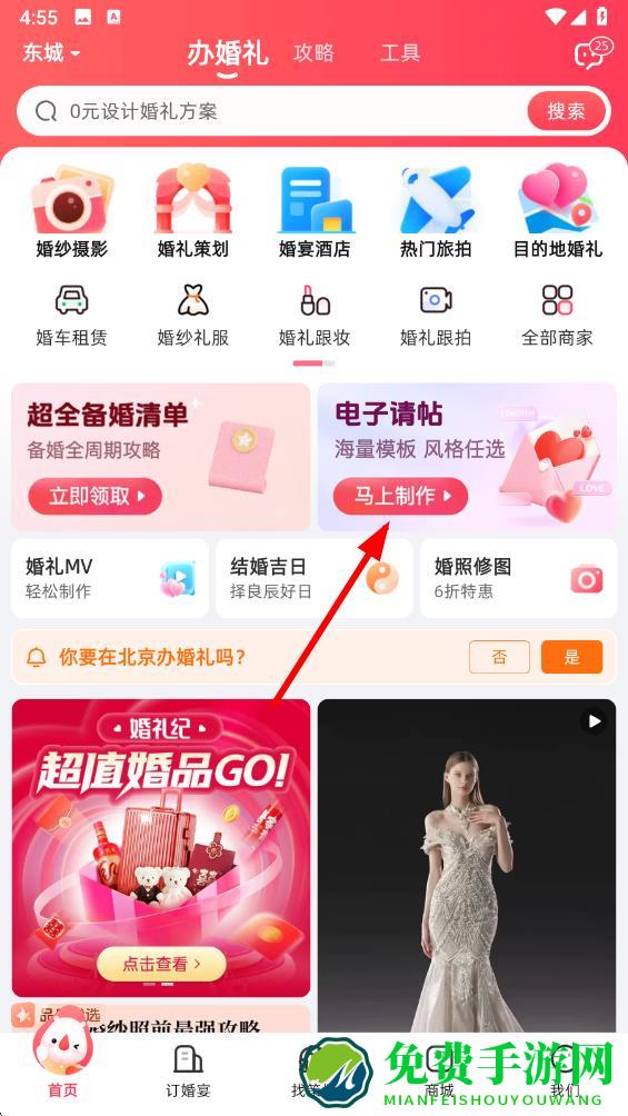 1、打开婚礼纪App进入首页点击电子请帖板块中的马上制作按钮,进入请帖制作选择页面。