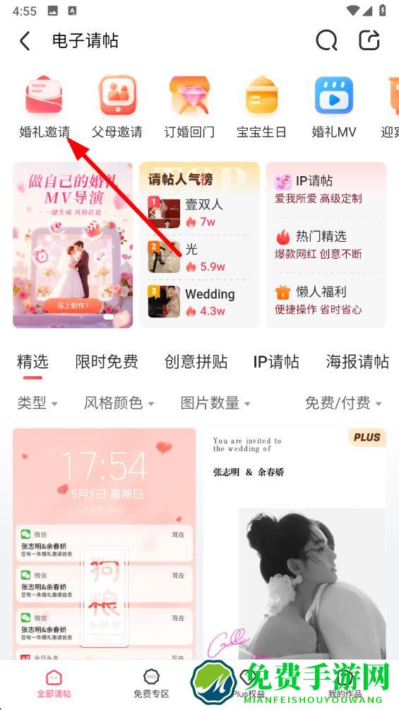 2、在请帖制作选择页面中点击婚礼邀请的选项卡,浏览各种婚礼邀请函模板。