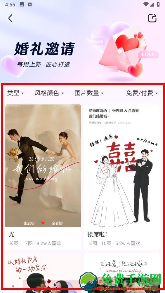 3、根据喜好从展示的众多婚礼邀请函模板中挑选心仪的模板,可依据类型、风格颜色、图片数量、免费付费等条件筛选。