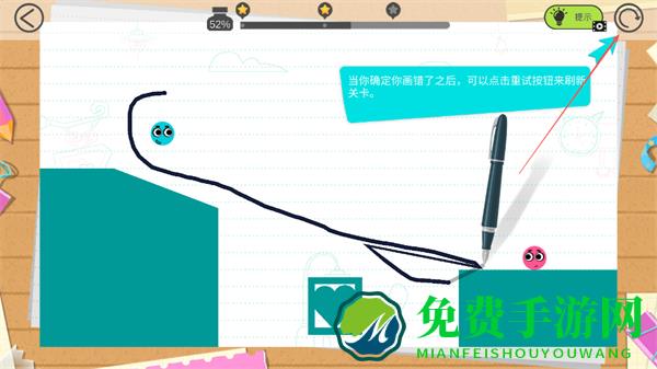 3、绘制好线条后,点击重试按钮,让蓝色小球沿线条移动,向粉色小球靠近。