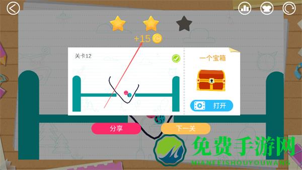 4、通关后获得星星评价和金币奖励如+15,点击下一关继续挑战,还可打开宝箱获取奖励。