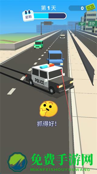 1、驾驶警车在道路上抓捕违规车辆,成功抓捕后会显示抓得好!。