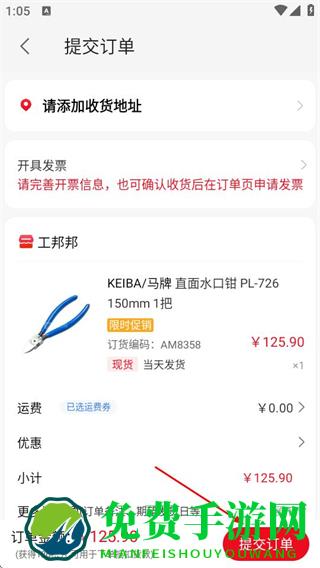 4、在提交订单界面添加收货地址、完善发票信息后点击提交订单完成购买。