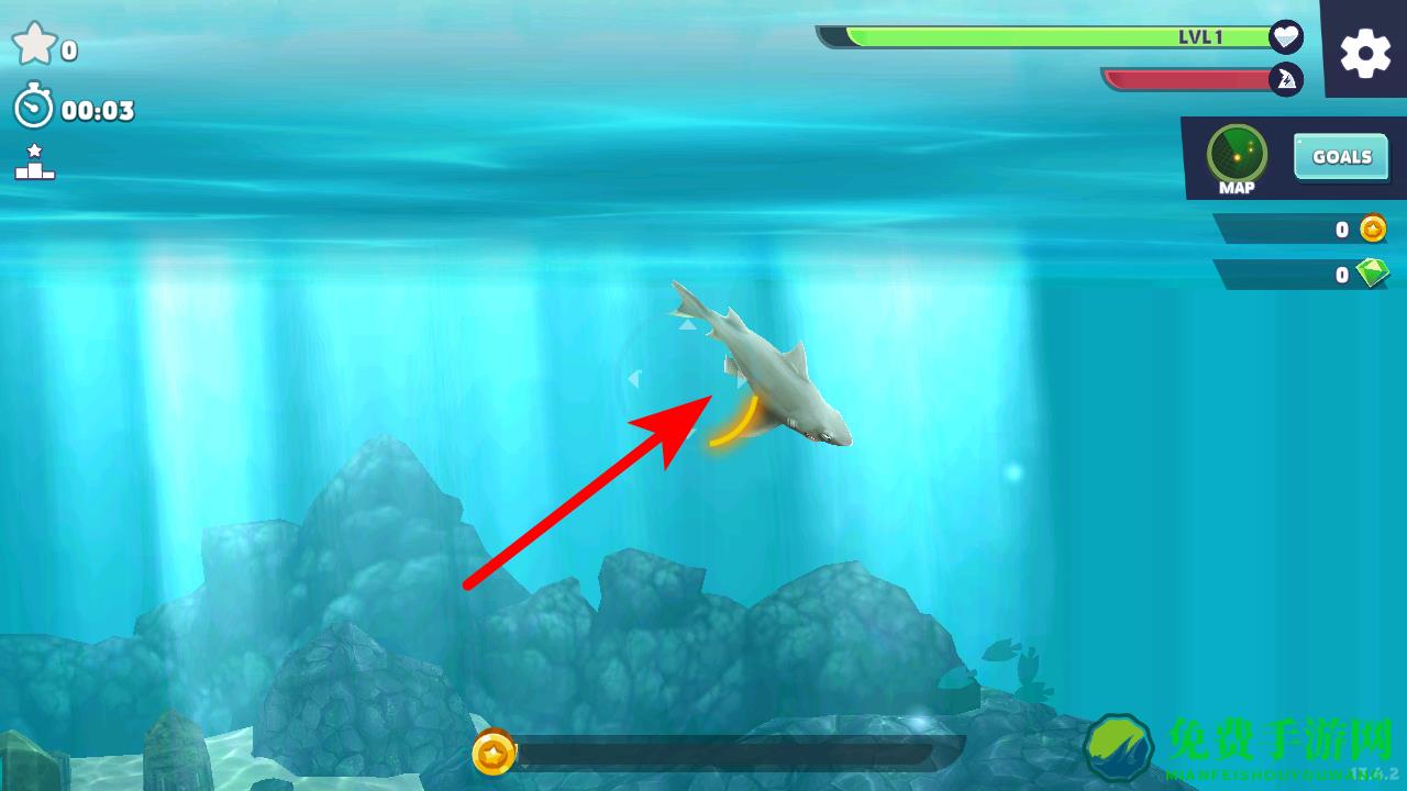 2、进入游戏后,操控鲨鱼在海洋中移动,通过滑动屏幕来控制鲨鱼的方向。