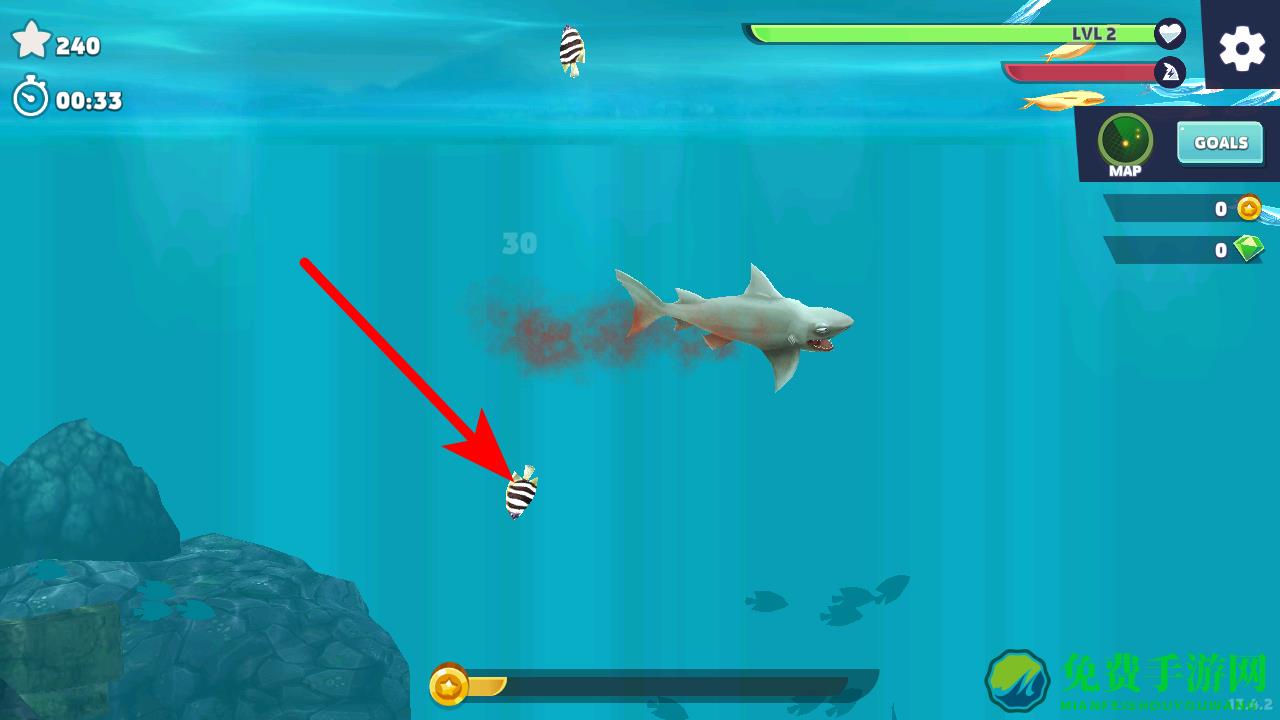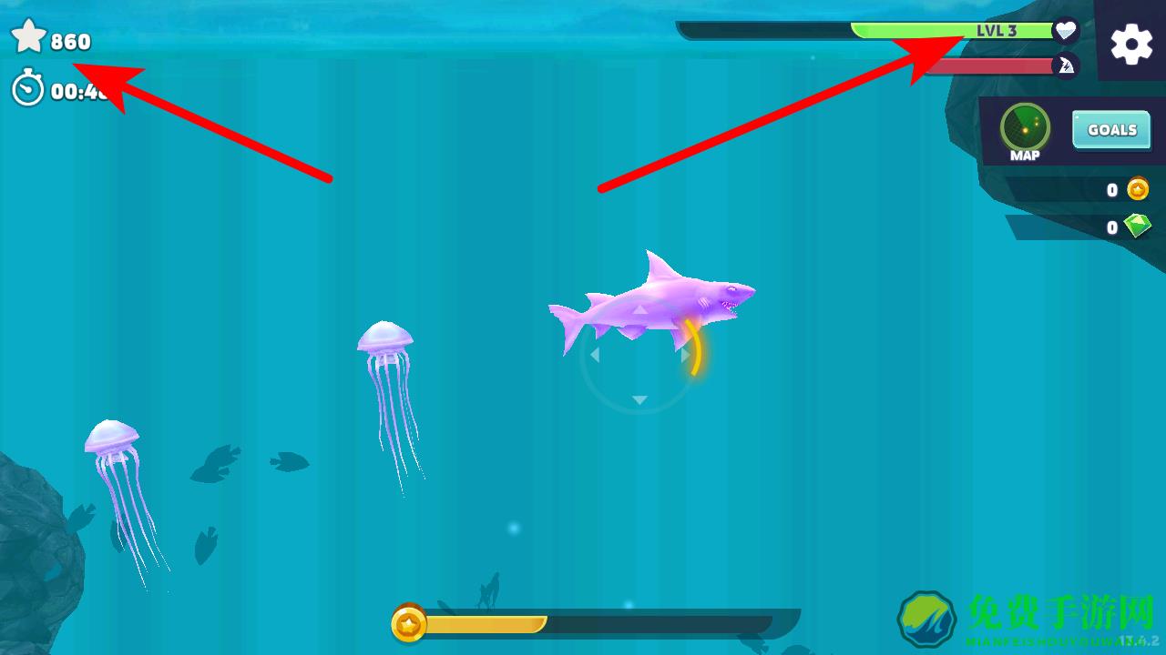 3、在海洋中寻找各种鱼类、海洋生物等进行捕食,获取分数和经验。