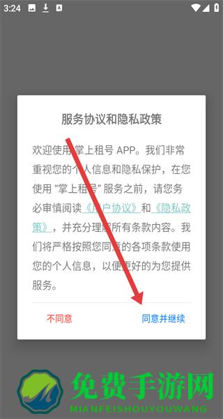 1、点击“服务协议和隐私政策”弹窗的“同意并继续”,进入掌上租号APP首页。