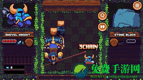 2、控制铲子骑士移动,靠近方块区域进行消除,形成连锁反应如3CHAIN可获得额外奖励。