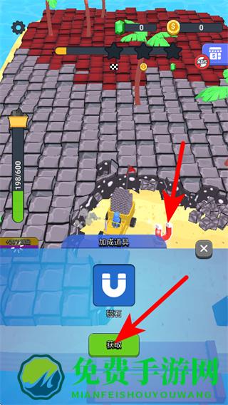 2、挖掘过程中,可获取加成道具,如磁石,点击获取按钮使用道具,助力资源收集。