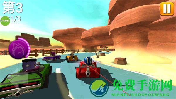 1、在沙漠赛道驾驶赛车与其他车辆竞速,争取提升名次。