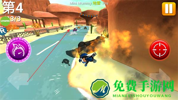 2、使用道具攻击对手,躲避障碍物和爆炸区域,保持赛车行驶。