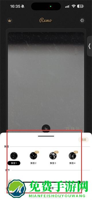 2、在视频拍摄模式下,选择喜欢的特效如飘雪特效,进入特效设置界面。
