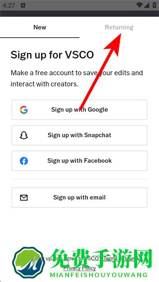 2、在账号注册选项页面中,点击右上角Returning标签,切换到登录/注册的返回用户界面。